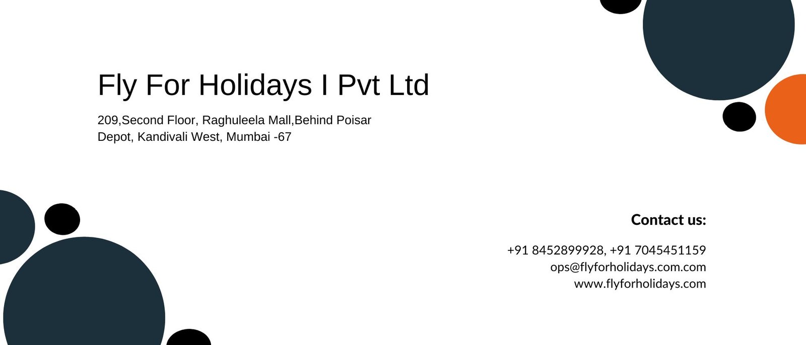 Fly For Holidays (I) Pvt Ltd. is an online travel company established on 11th May 2016 in India, headquartered in Mumbai, Maharashtra. We are registered under the Indian companies act, 2013 and it is limited by shares privately held by the family member. We are into online Travel Services for Domestic and International tours. We provide services like booking Holiday Packages, Air Tickets, Visa Assistance, Hotel Reservation and Cab Hiring Services.